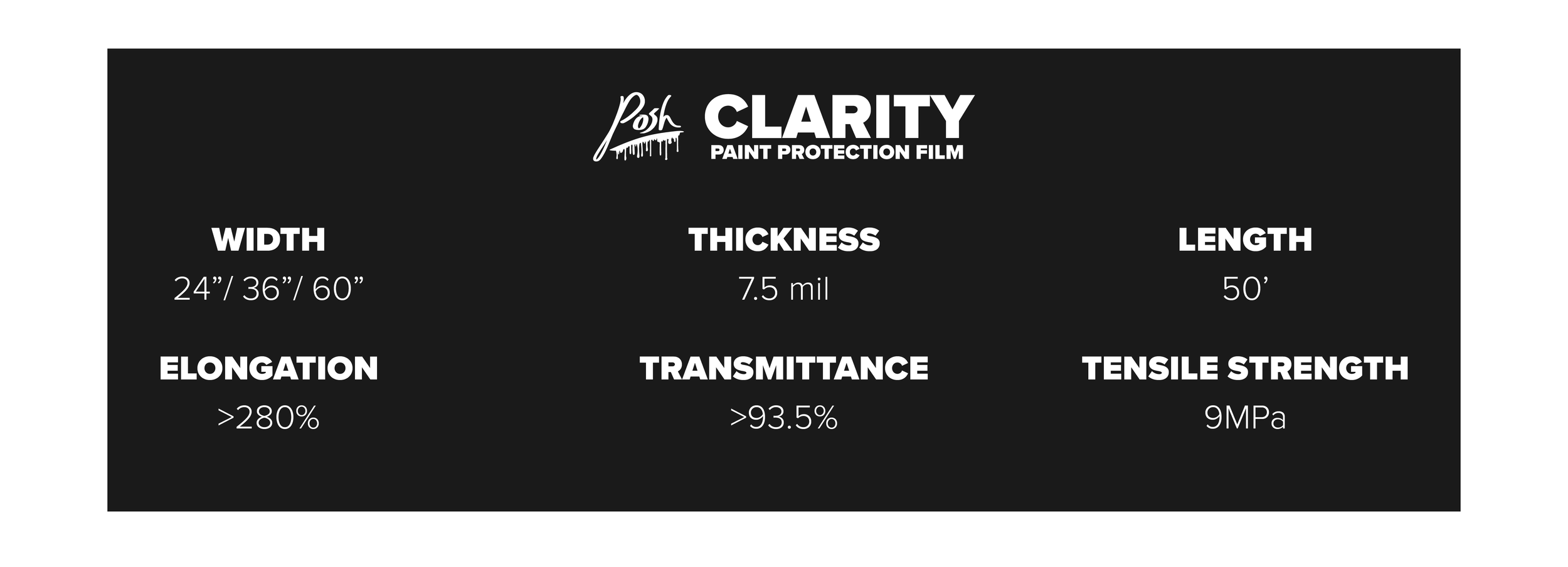 Posh Clarity Gloss PPF offers exceptional protection against rock chips, road debris and scratches, all while giving your vehicle's paint an extremely smooth finish. Its advanced topcoat technology is extremely hydrophobic, and resistant to stains, ensuring lasting clarity while keeping your vehicles paint protected, in any driving environment.